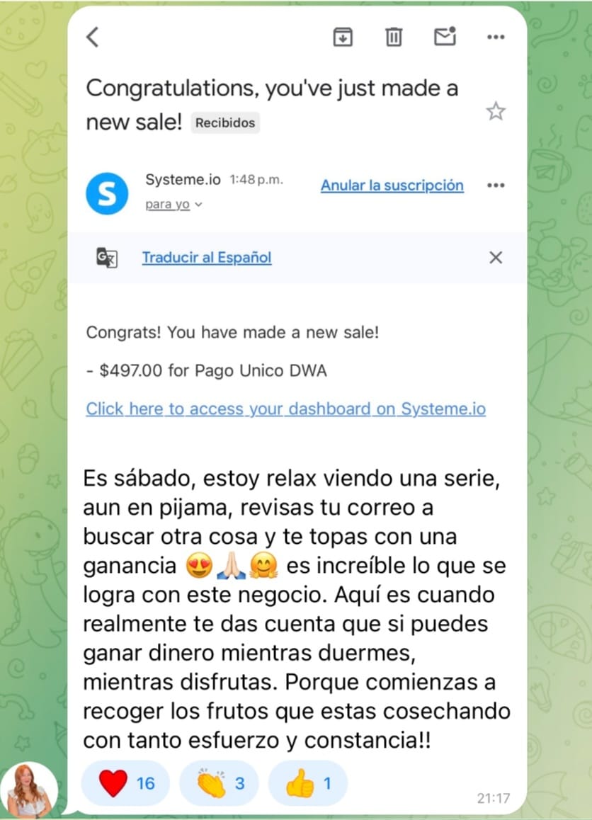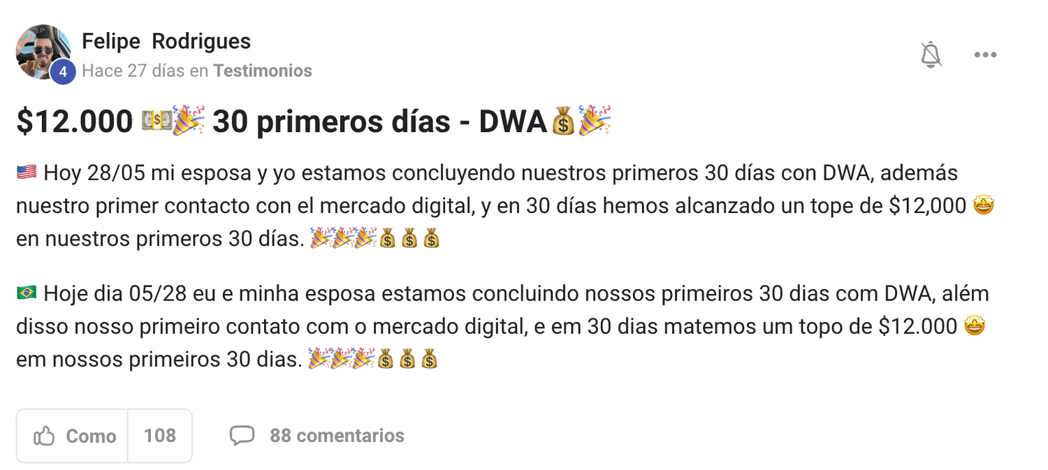 Después de ver tantos cursos digitales qu no me convencían del todo, encontré uno en el que muchos estaban ganando miles de dólares, invirtiendo sólo 2-3 hrs al día, llamado Digital Wealth Academy. Leí toda la información, y entonces me pregunté, por qué no lanzarme? Si aparte de ganar por cada venta, me quedo con todas las herramientas y conocimientos de por vida sobre el marketing digital para también generar ingresos online de muchas maneras. Y así llegó DWA a mi vida y fue la mejor decisión que pude haber tomado.